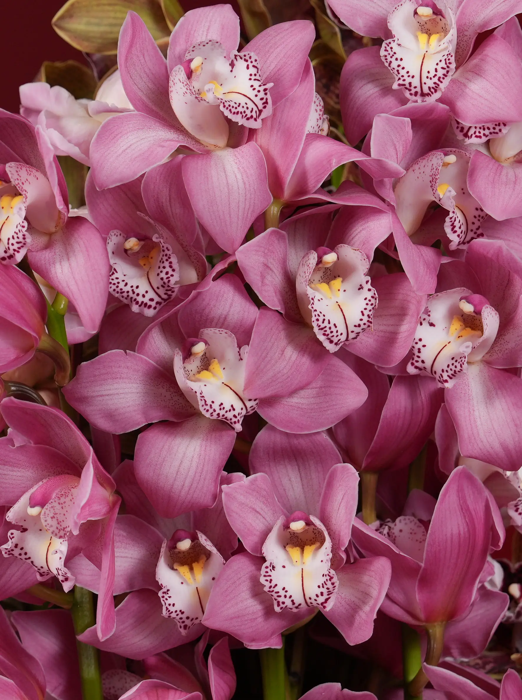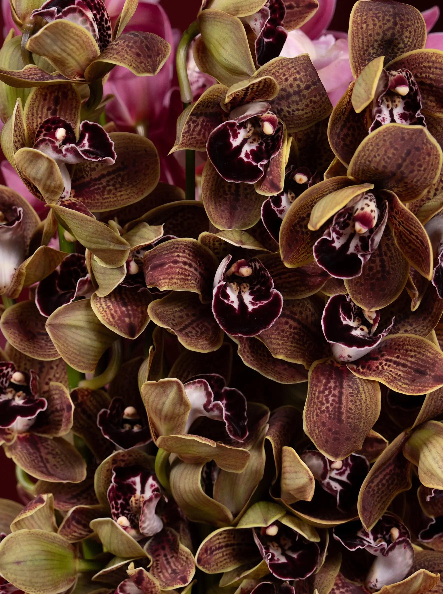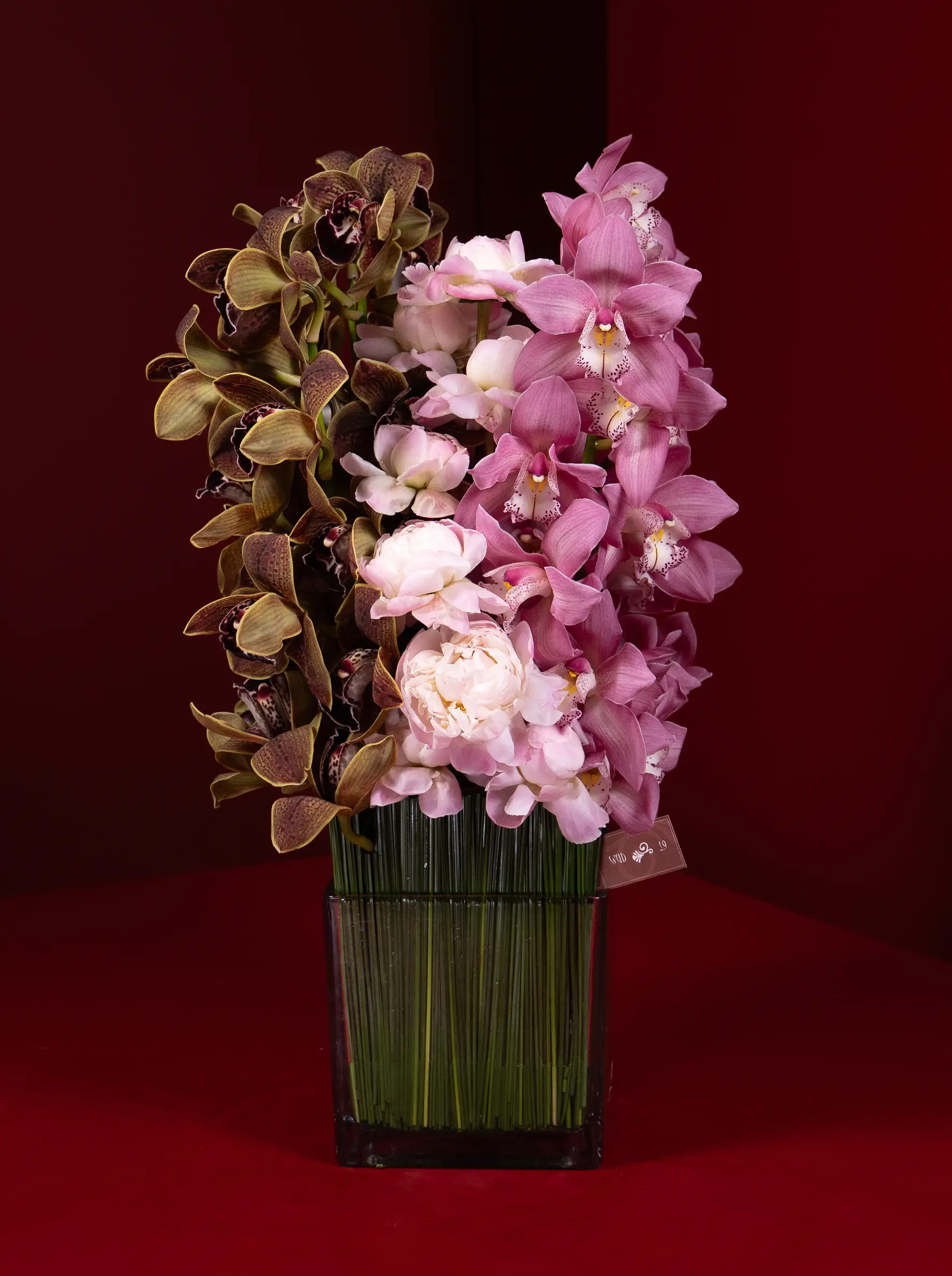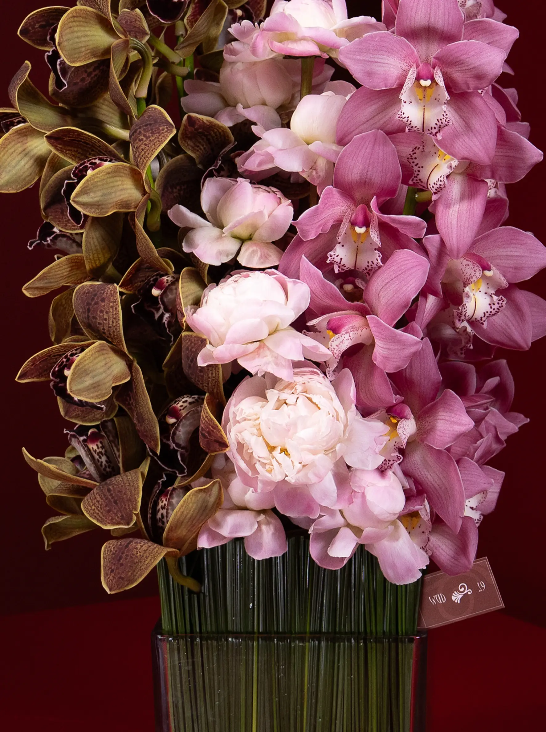 A graceful symphony of blush pink peonies and vibrant cymbidiums entwined with rich, earthy orchids. This elegant arrangement plays with texture and color, evoking a tender melody of nature’s beauty and refined charm.