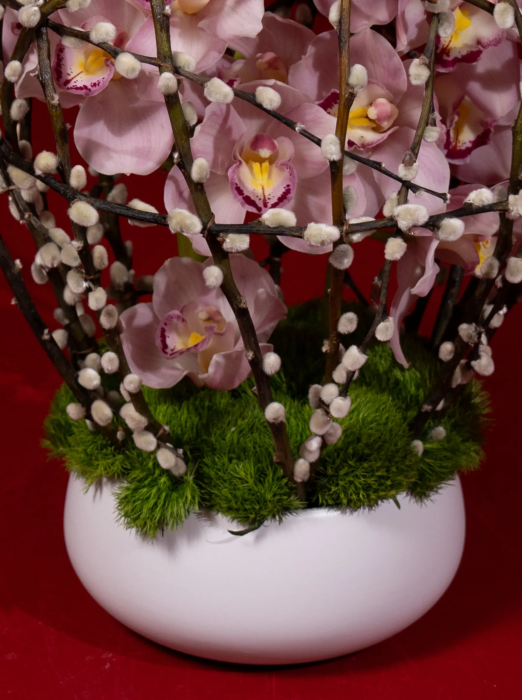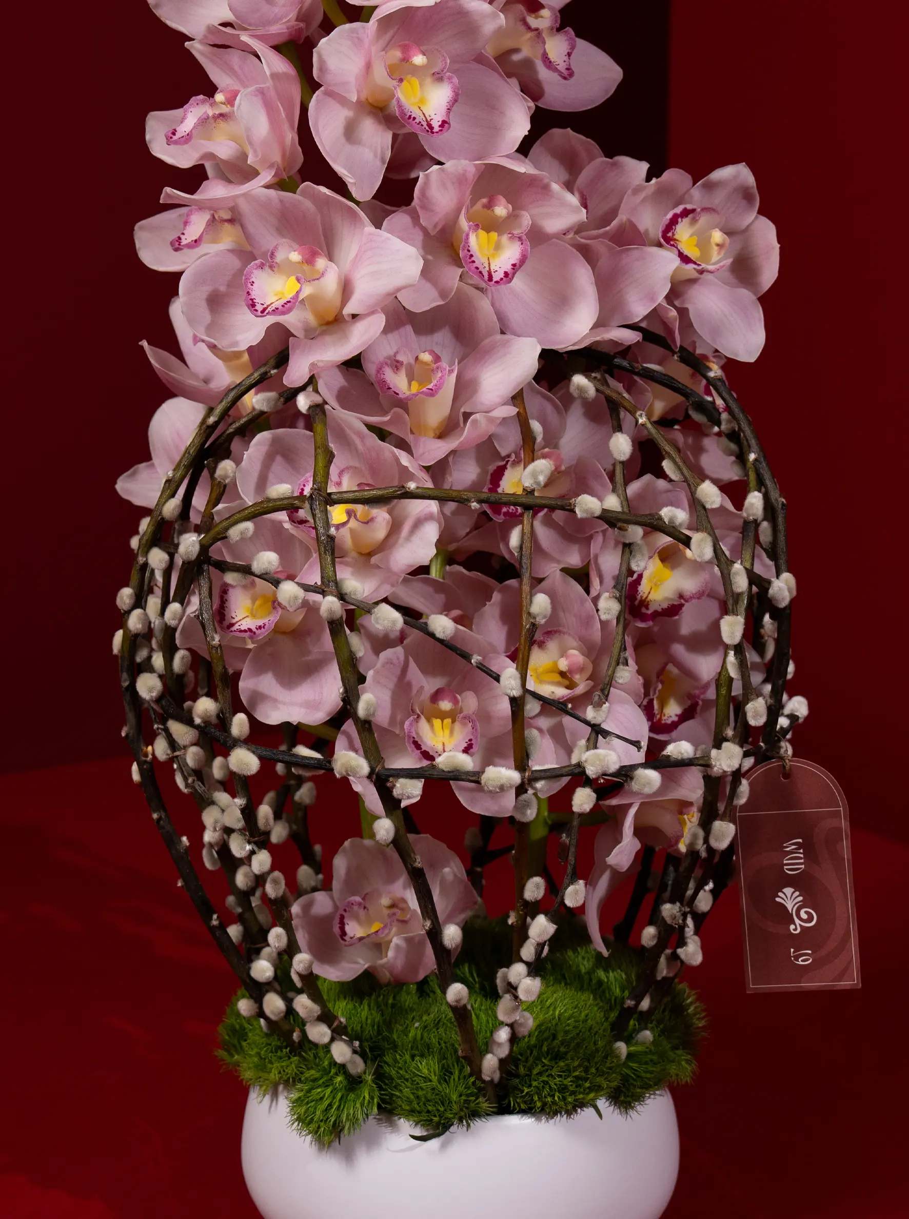 Delicate pink cymbidium blossom gracefully within an artistic cage of natural branches. Set in a sleek white base with lush green accents, this unique floral design blends nature and modern elegance perfectly.