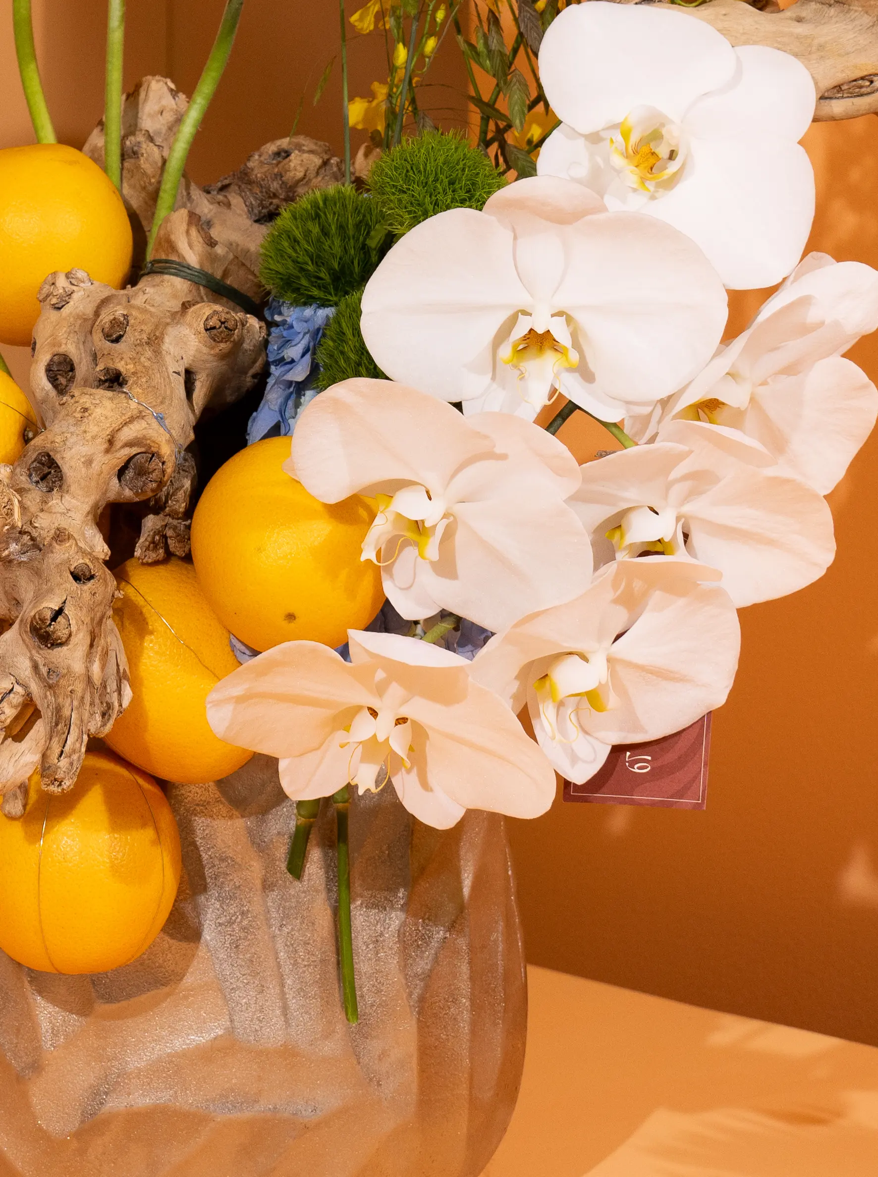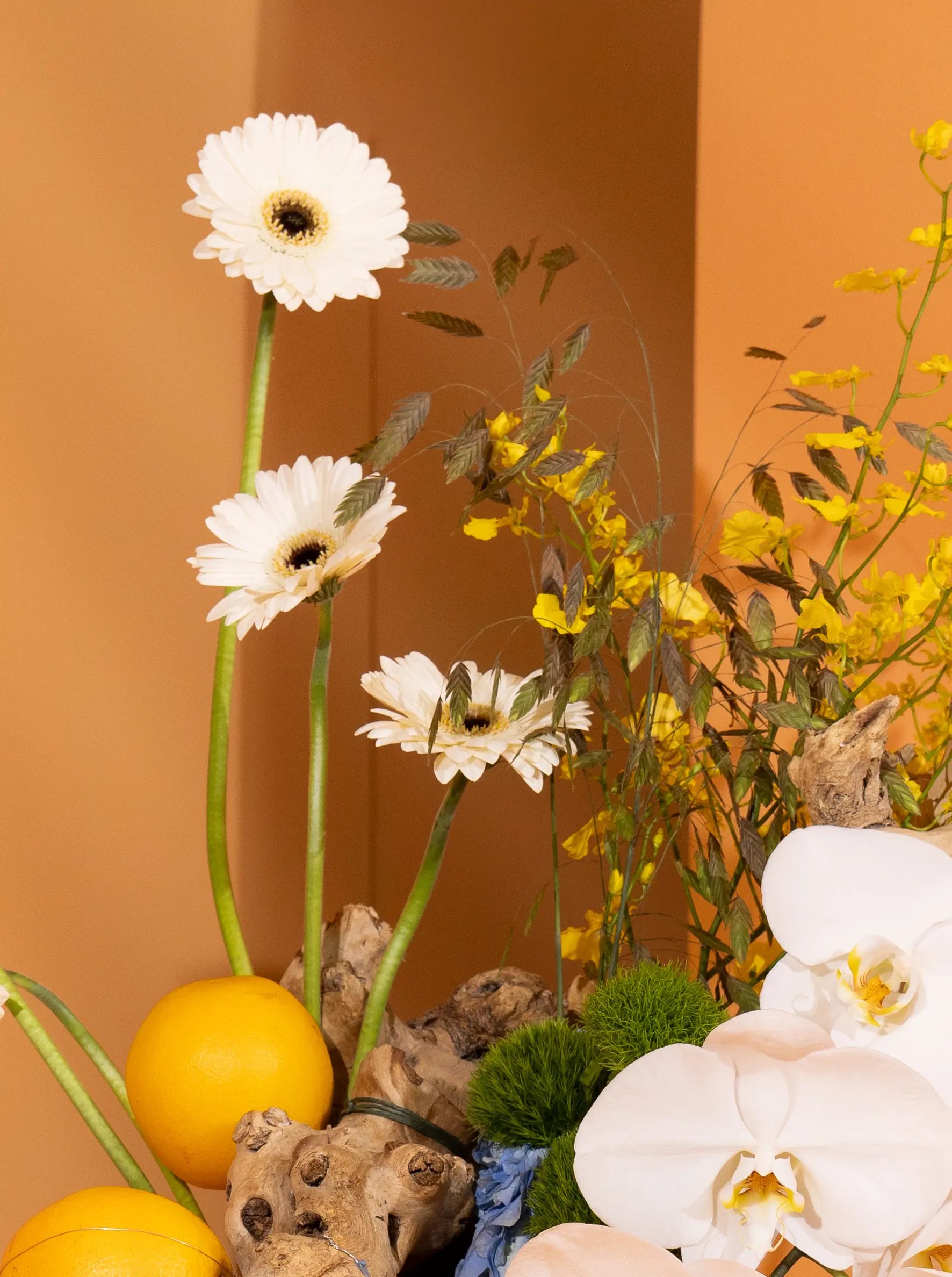 Citrus Bloom Artisan Arrangement blends fresh white orchids, cheerful daisies, golden citrus accents, and sculptural driftwood for a striking, contemporary display, this unique piece adds natural elegance and a pop of sunshine to any room.