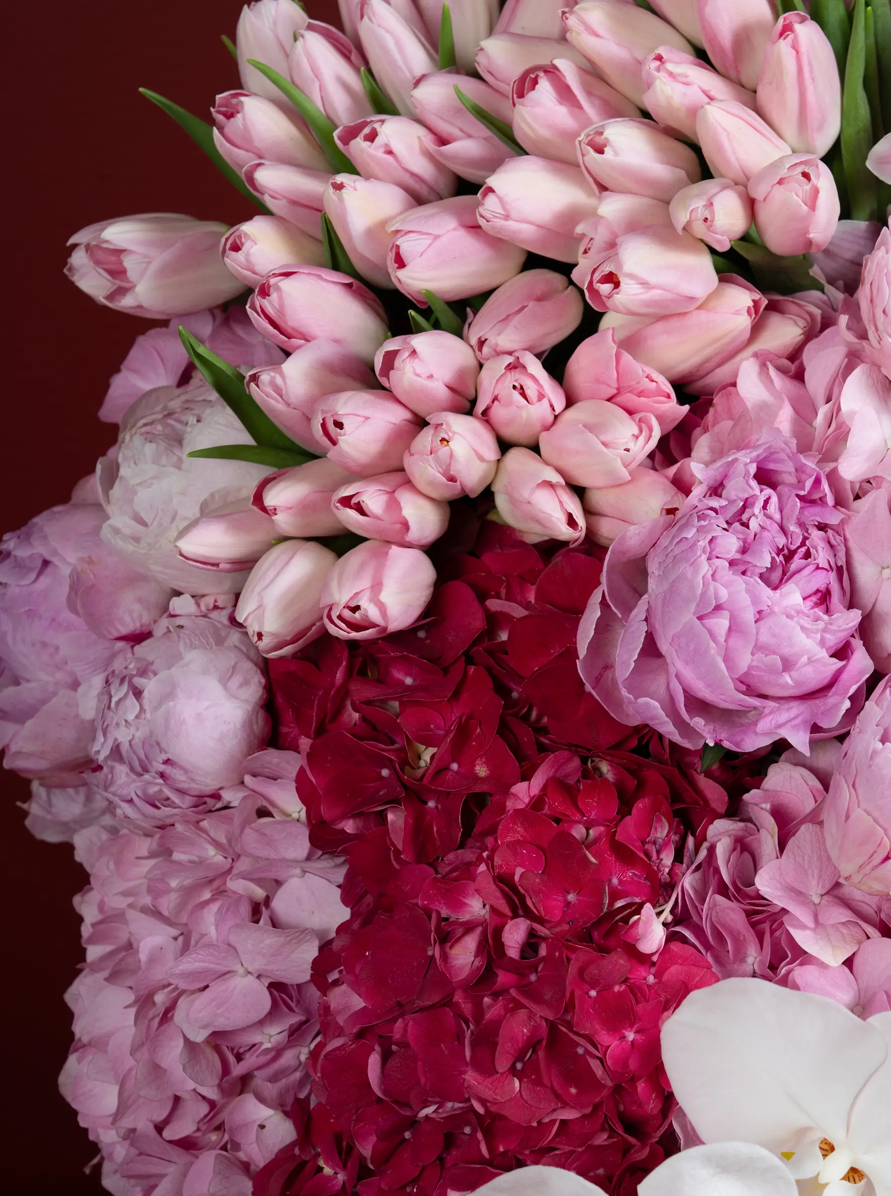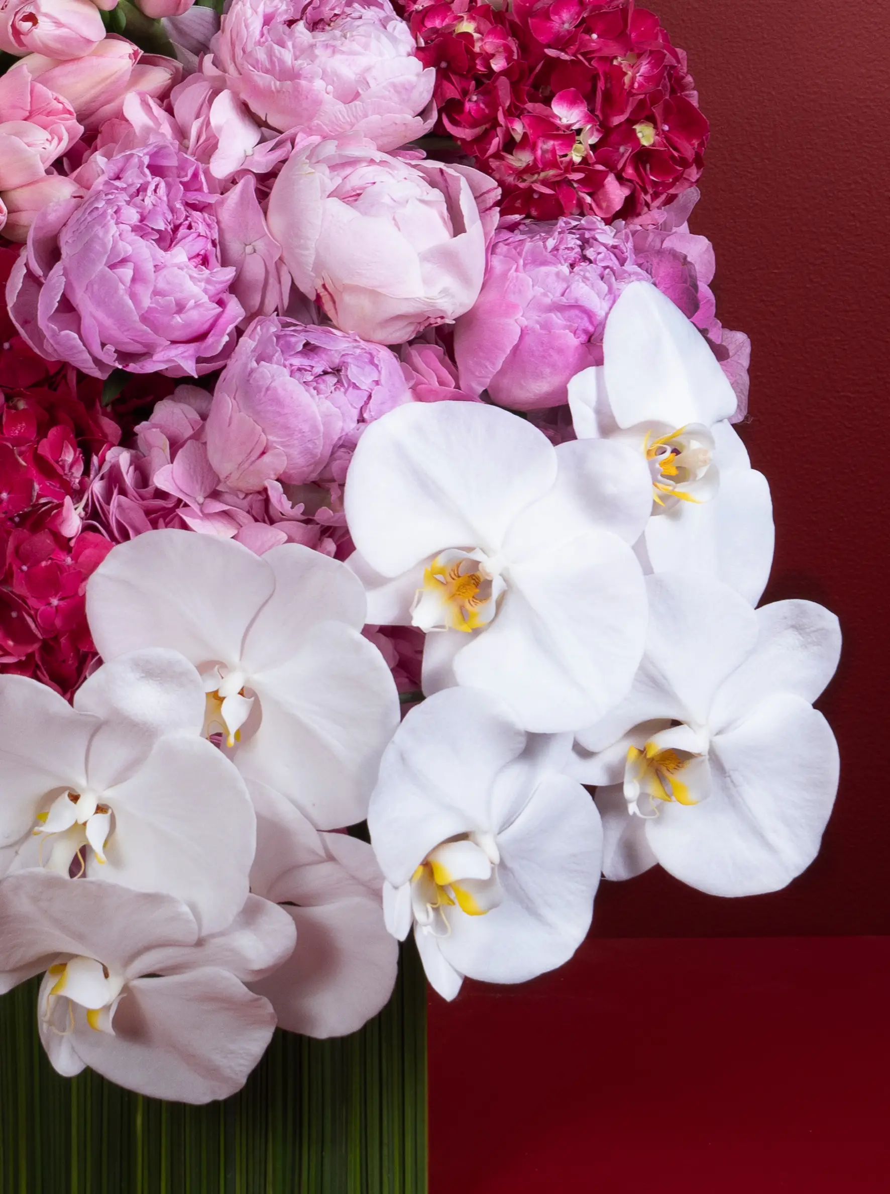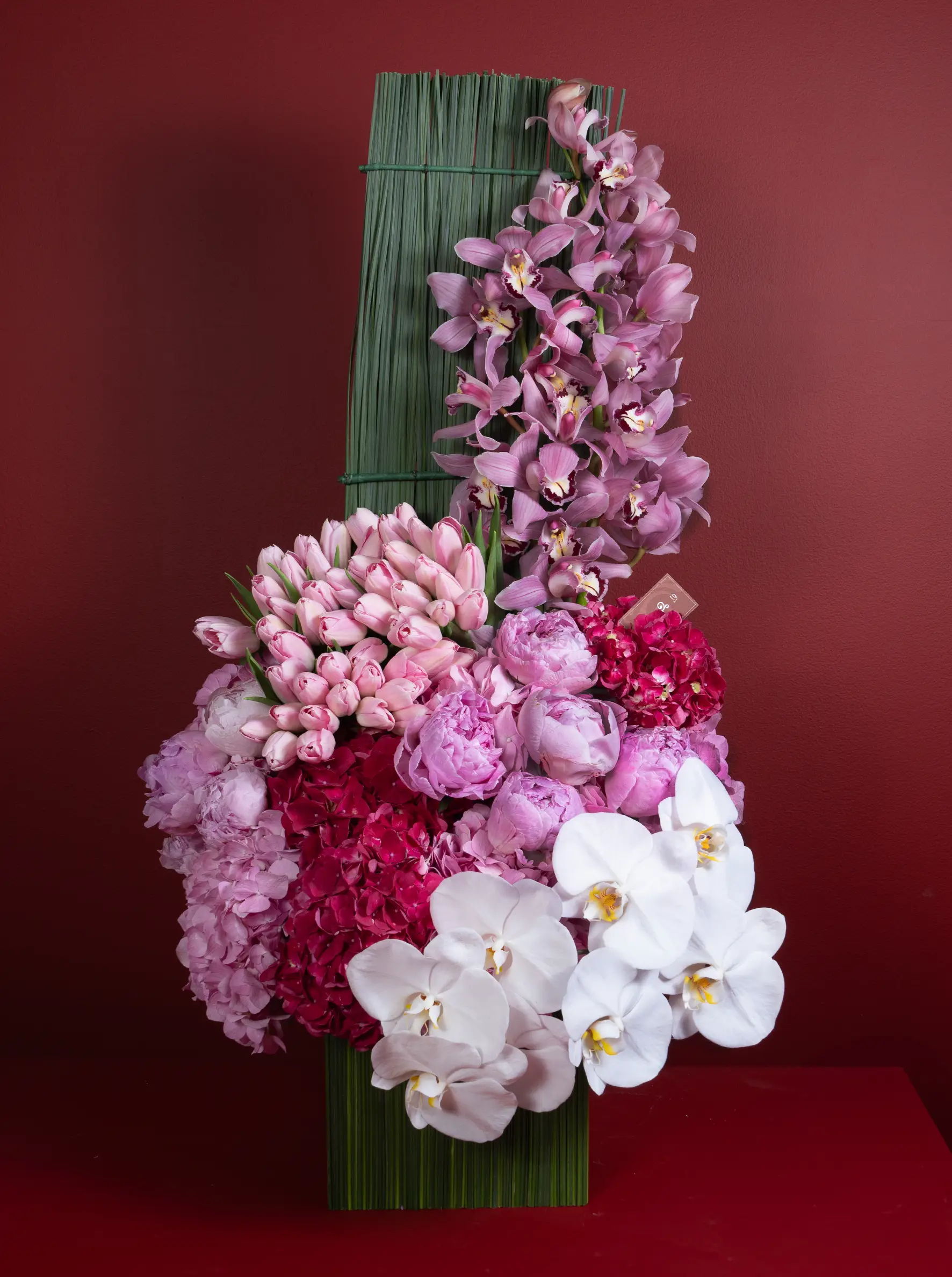 Dive into a dreamscape of soft pinks and bright whites, where delicate peonies, phalaenopsis orchids, cymbidium, pink tulips, and vibrant red hydrangeas bloom amidst a textured green canvas. This romantic arrangement evokes a serene and enchanting mood, perfect for adding elegance and warmth to any space.