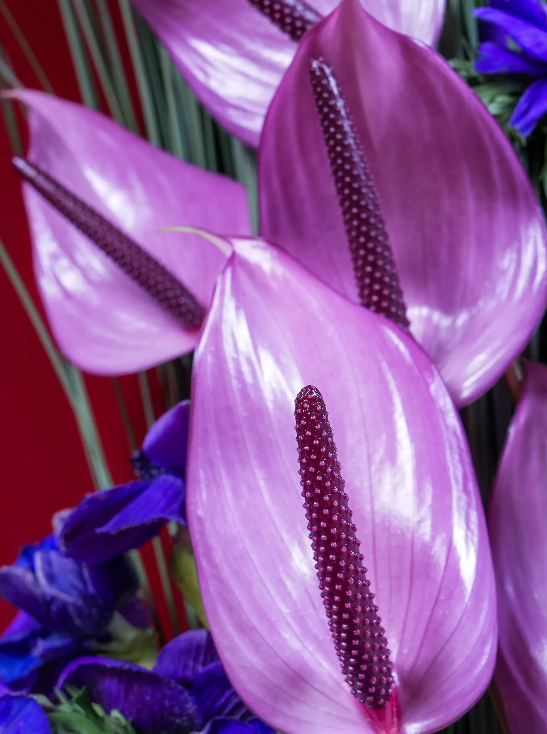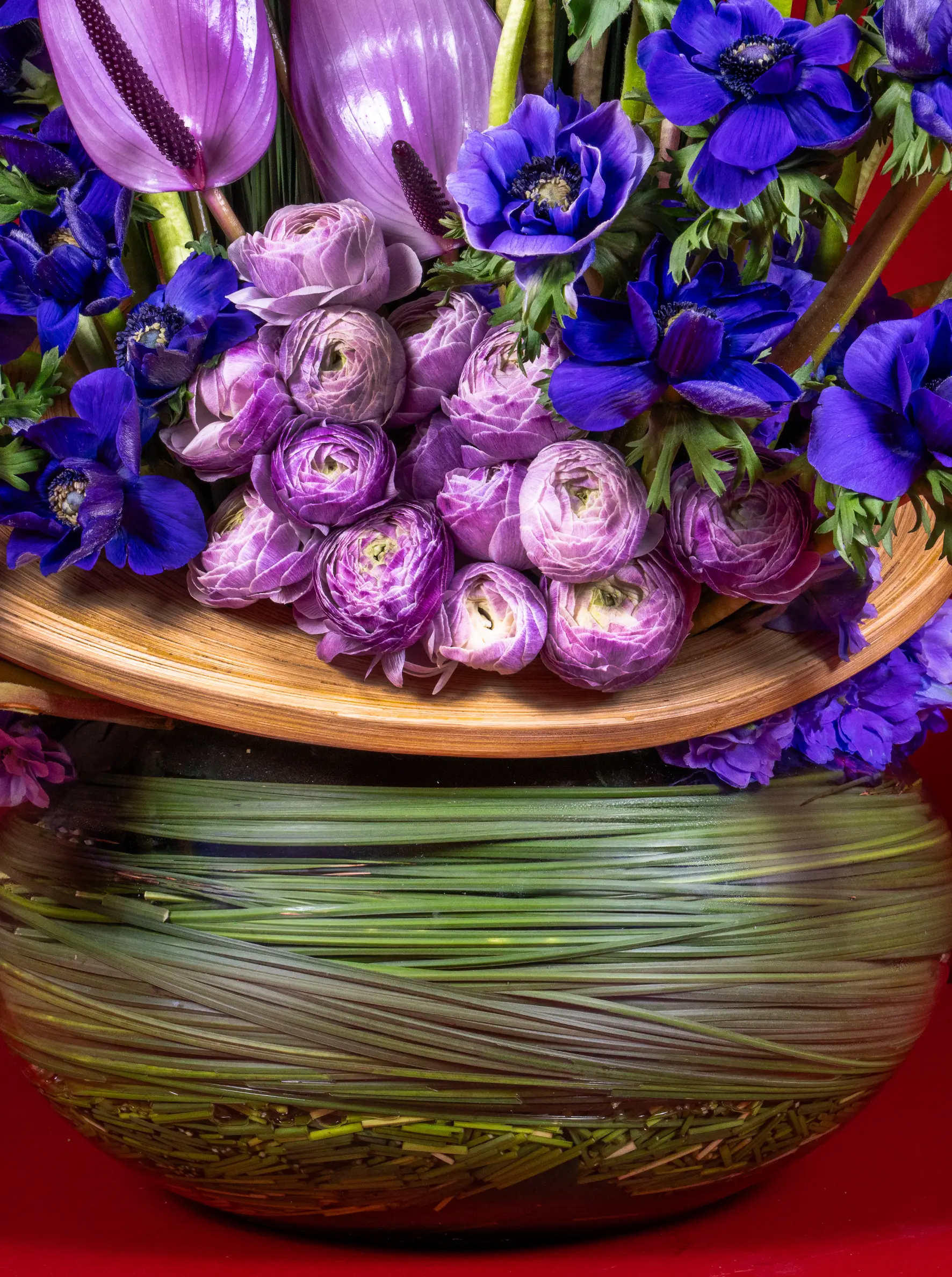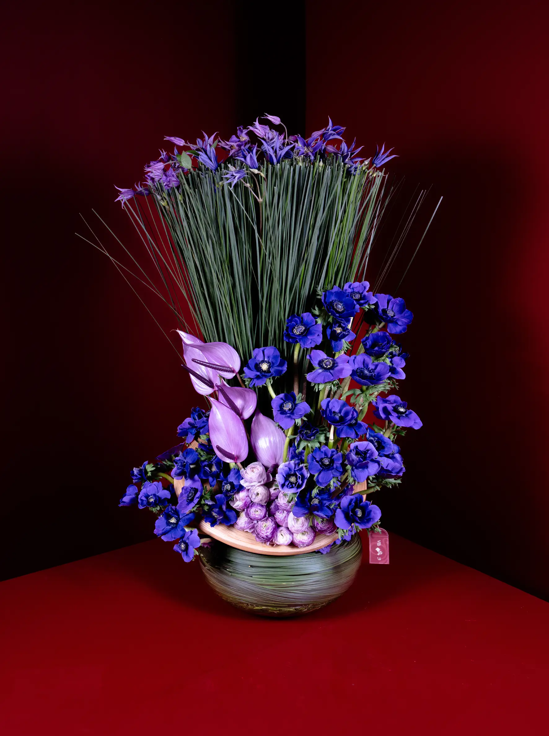 A symphony of deep indigo anemones, sculptural lilac calla lilies, and delicate lavender rosettes rise from a bed of verdant green reeds — this bold arrangement evokes the mystery of twilight and the elegance of a moonlit sonata.