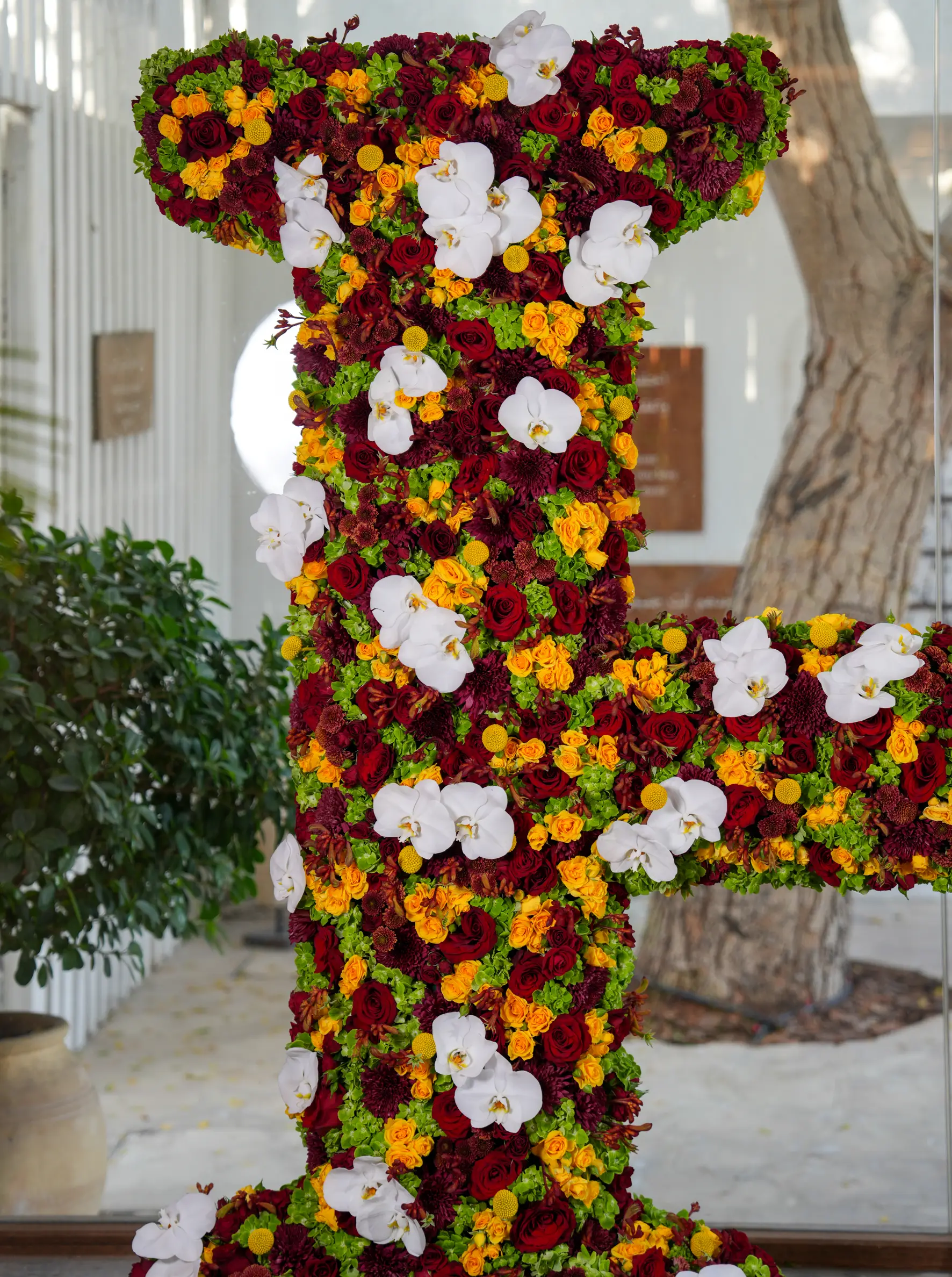 Crafted from a rich blend of fresh seasonal florals and delicate white orchids, this bold monogram “H” is more than décor — it’s a symbol of identity, power, and grace. Nestled atop a mossy base and standing tall in natural light, it commands attention while evoking earthy elegance.